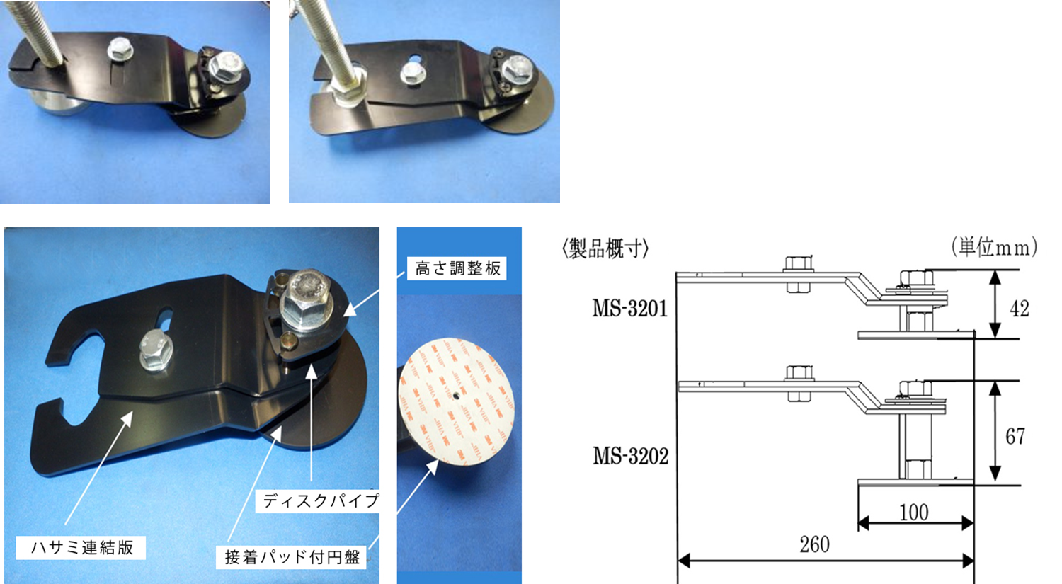 ・ハサミ連結板でレベルアジャスターのボルトを挟む構成により、製品全体の高さが抑えられているので各種機器・装置の設置スペース内に取り付けが可能です。